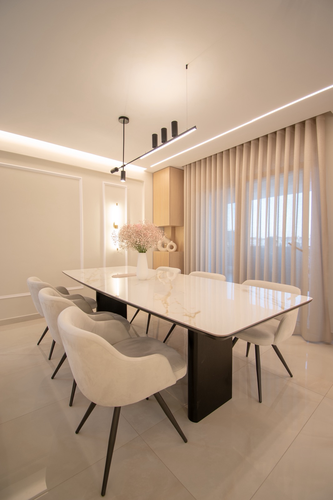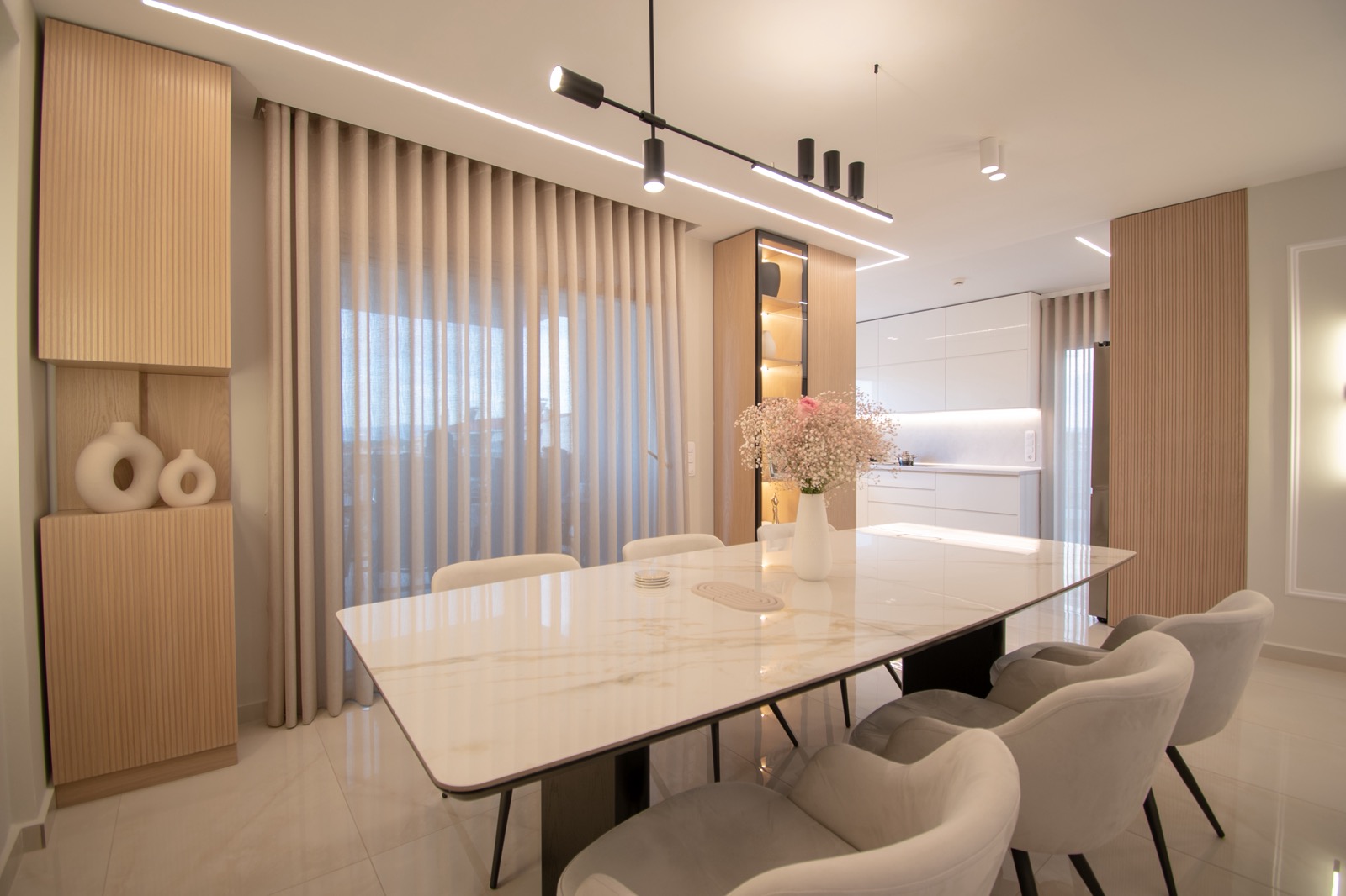 Tραπεζαρία με βάση σε Δρυς και καπάκι κεραμικό. Βιτρίνα σε Δρυς με πόρτα αλουμινίου φιμέ